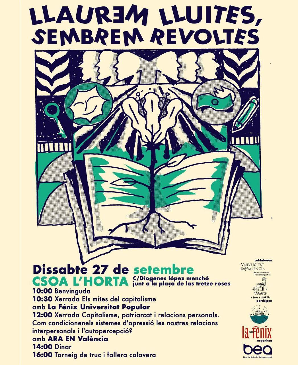En aquestes reflexionarem sobre com el capitalisme afecta els nostres pensaments, formes de viure i de relacionar-nos amb dues xarrades: una portada a terme per la Fènix i l’altra per ARAEN València. A continuació, tindrem un dinar (preu a la voluntat) i per finalitzar el dia hi haurà un torneig de Truc i Fallera Calavera.