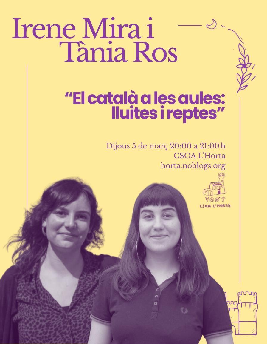 Irene és Doctora en Filologia Catalana per la Universitat d’Alacant i militant d’Endavant. Tània és estudiant de Filologia Catalana a la UB i militant del SEPC. Ambdues, conduiran una ponència anomenada «El català a les aules: lluites i reptes» al CSOA, un centre social okupat anarquista que porta molts anys arrelat al barri de Benimaclet i teixint resistències!✊🏻