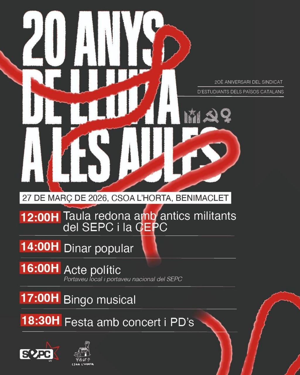 Aquest any el SEPC compleix 20 anys des de la seua creació, i vos convidem a celebrar-ho amb nosaltres aquest 27 de març al CSOA.